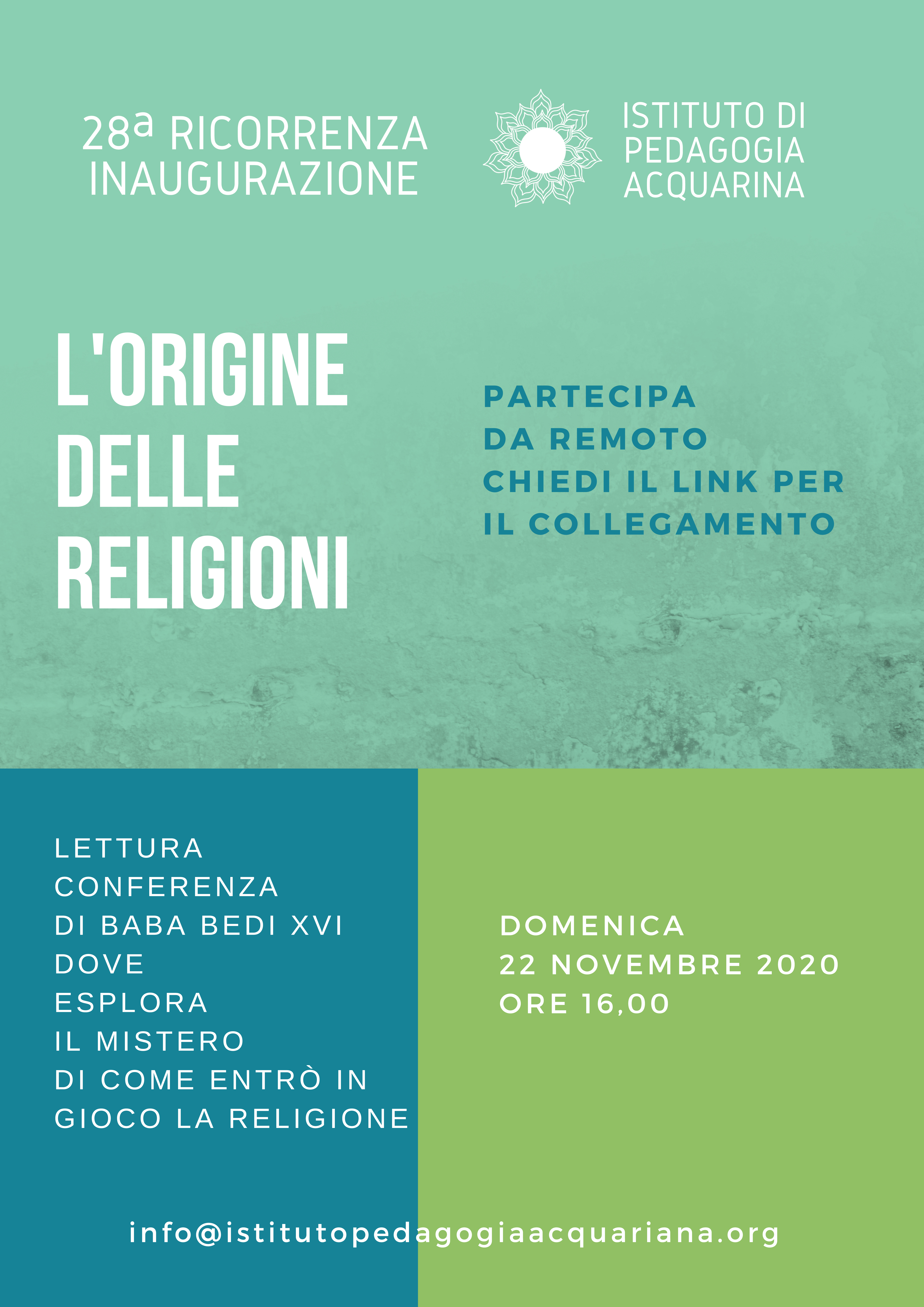 Per la 28ª Ricorrenza dell’Inaugurazione dell’Istituto di Pedagogia Acquariana, proponiamo la lettura della conferenza di Baba Bedi XVI “L’origine delle religioni”. A noi sembra di interessante attualità, considerando la visione di Baba portatrice di conoscenza e di spunti per riflessioni personali, stimolo per nuove considerazioni individuali su una tematica che ha accompagnato la storia umana. Auspichiamo che molte persone possano partecipare e possano portare, se lo desiderano, anche la loro testimonianza. Un incontro online in videoconferenza domenica 22 novembre 2020 alle ore 16 sulla piattaforma Zoom.us. Comunicare al sito dell’Istituto, tre giorni prima dell’incontro, la volontà di iscriversi, per ricevere il linK di collegamento. locandina.jpg